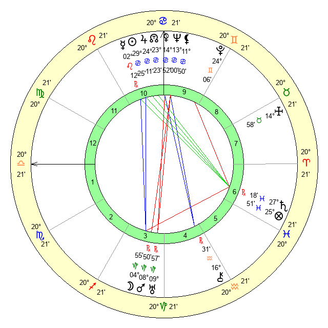 | Sun | 29 Cancer 26 | 0 Leo 51 | 24 Scorpio 58 |