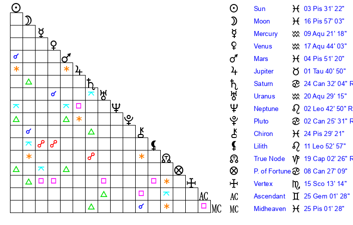 | Sun | 3 Pisces 31 | 4 Pisces 19 | 19 Gemini 12 |