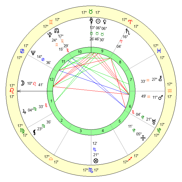 | Moon | 10 Leo 44 | 6 Taurus 15 | 0 Scorpio 50 |