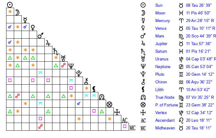 | Venus | 5 Taurus 11 | 29 Pisces 19 | 23 Cancer 46 |