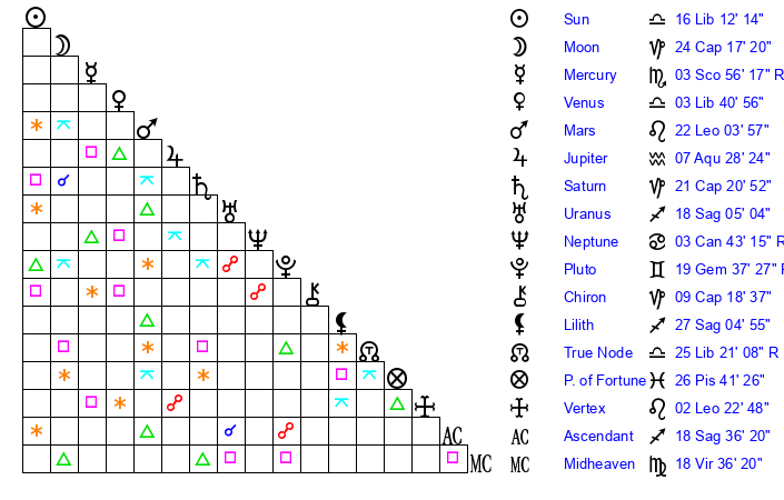 | Sun | 16 Libra 12 | 17 Libra 24 | 20 Aquarius 33 |