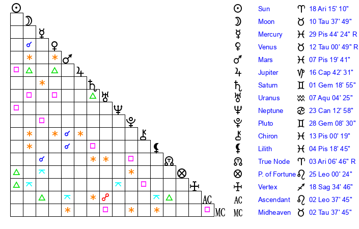 | Moon | 10 Taurus 45 | 1 Virgo 40 | 14 Gemini 45 |