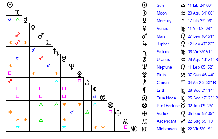 | Saturn | 7 Virgo 19 | 27 Pisces 17 | 11 Virgo 45 |