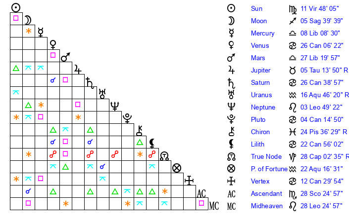 | Sun | 11 Virgo 48 | 12 Virgo 25 | 0 Capricorn 33 |