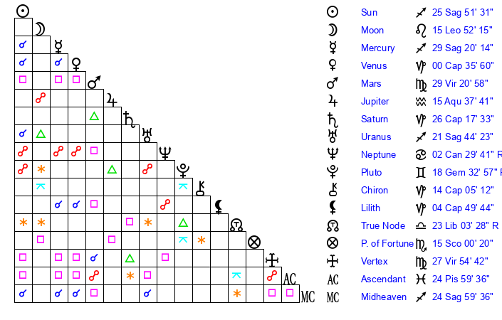 | Saturn | 26 Capricorn 44 | 25 Pisces 26 | 9 Aquarius 4 |