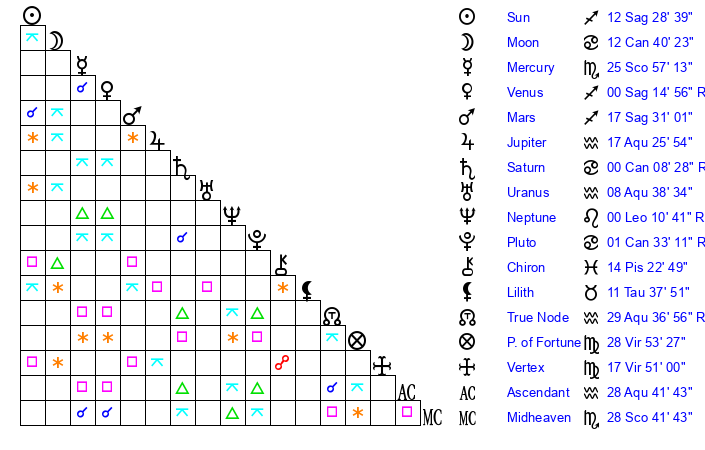 | Mercury | 25 Scorpio 57 | 23 Scorpio 13 | 7 Pisces 44 |