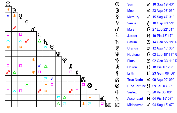 | Moon | 23 Aquarius 1 | 14 Virgo 51 | 28 Aquarius 41 |