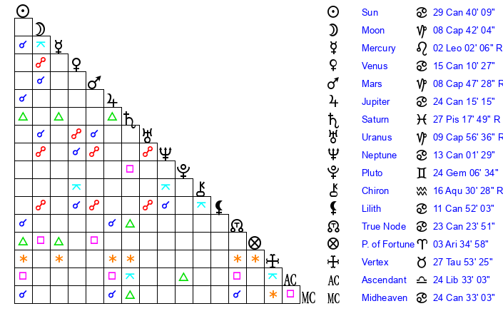 | Moon | 8 Capricorn 43 | 16 Cancer 48 | 9 Taurus 56 |