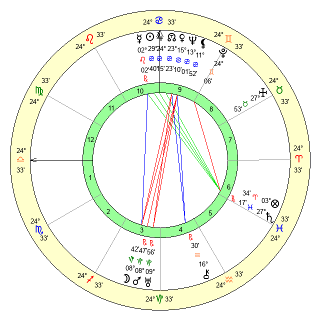 | Sun | 29 Cancer 40 | 1 Leo 5 | 25 Scorpio 13 |