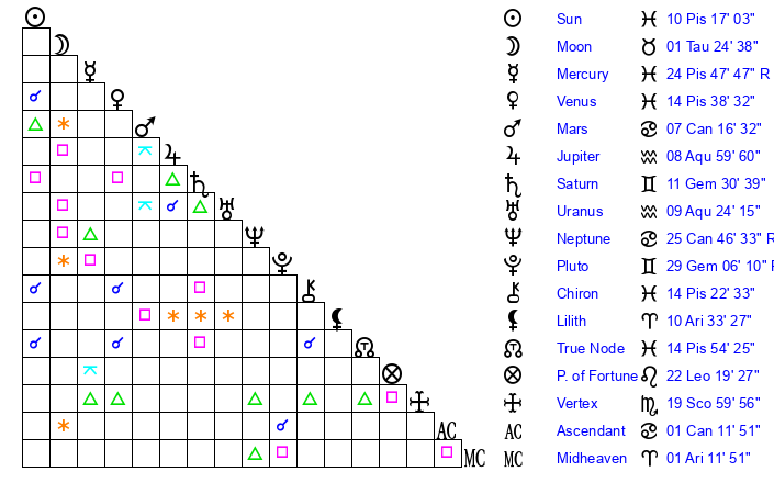 | Sun | 10 Pisces 17 | 11 Pisces 22 | 28 Gemini 29 |
