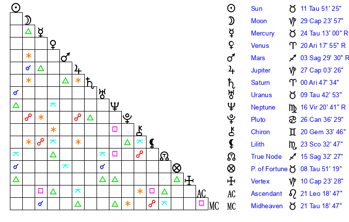| Sun | 11 Taurus 51 | 12 Taurus 32 | 6 Leo 7 |