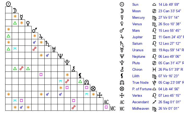 | Neptune | 6 Leo 49 | 0 Aries 20 | 5 Leo 46 |