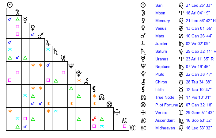 | Mercury | 21 Leo 57 | 9 Leo 26 | 19 Sagittarius 55 |