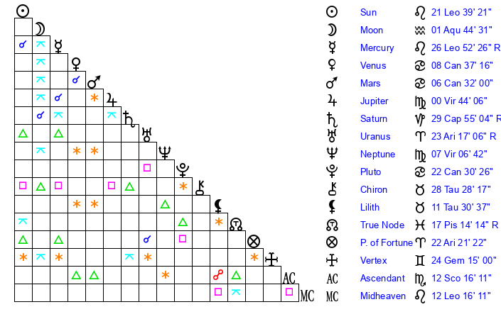 | Mercury | 26 Leo 52 | 4 Leo 55 | 15 Sagittarius 34 |