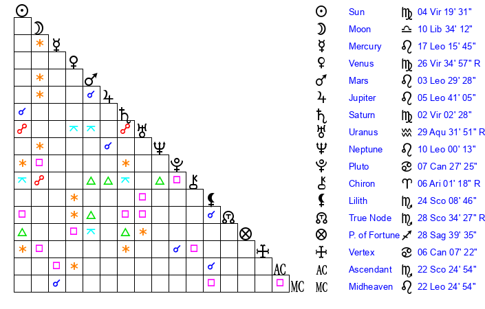 | Venus | 26 Virgo 34 | 3 Leo 36 | 3 Scorpio 56 |