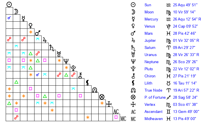 Pluto | 22 Virgo 12 | 2 Aquarius 30 | 20 Virgo 45 |