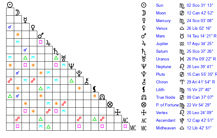 | Sun | 2 Scorpio 31 | 3 Scorpio 32 | 12 Aquarius 52 |