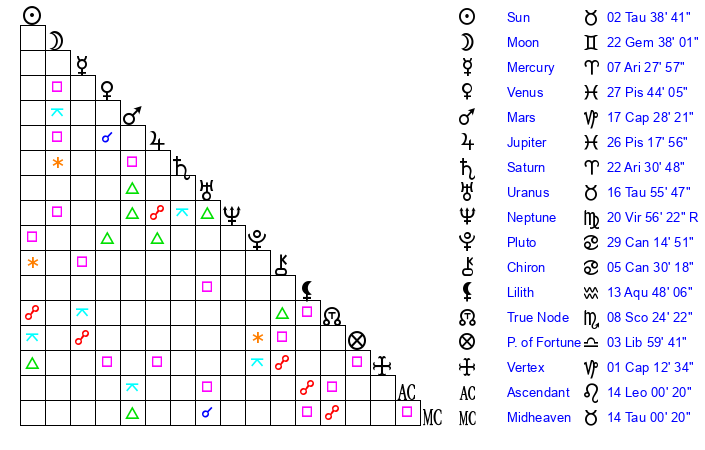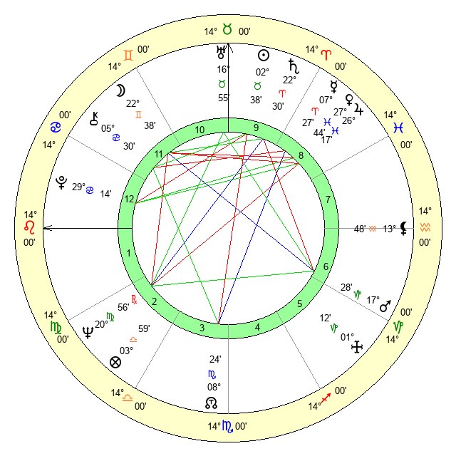 | Moon | 22 Gemini 44 | 6 Pisces 54 | 21 Leo 4 |