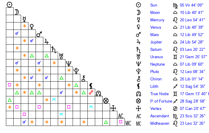 | Sun | 5 Virgo 44 | 6 Virgo 36 | 23 Scorpio 45 |