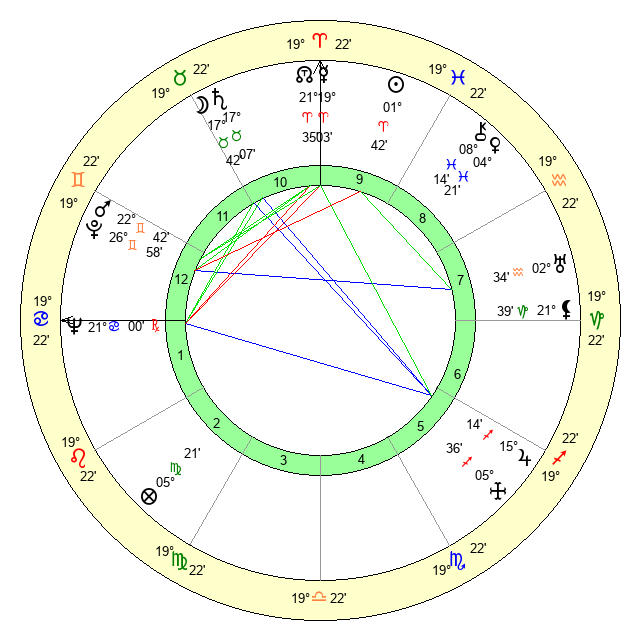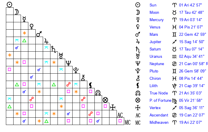 | Sun | 1 Aries 43 | 2 Aries 19 | 20 Cancer 53 |