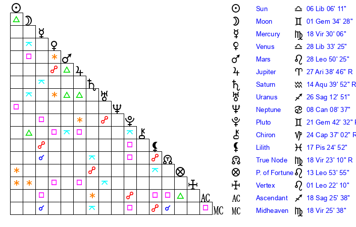 | Sun | 6 Libra 6 | 6 Libra 48 | 8 Aquarius 8 |