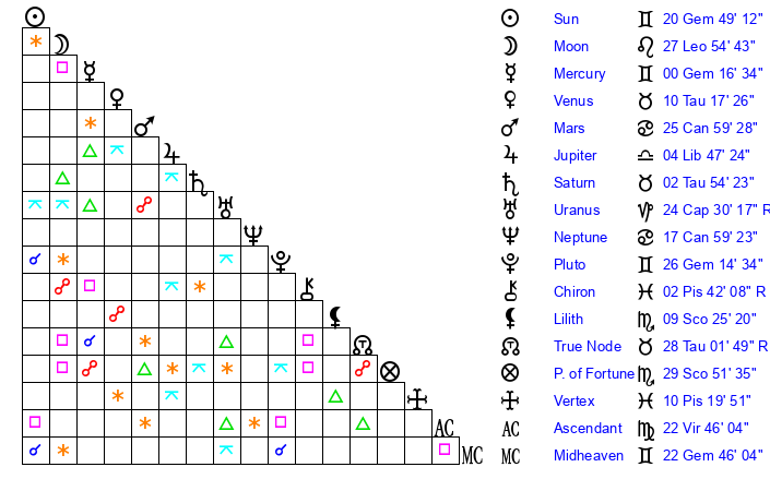 | Sun | 20 Gemini 49 | 21 Gemini 58 | 11 Libra 34 |