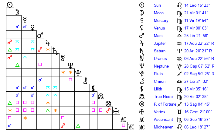 | Moon | 21 Virgo 2 | 12 Capricorn 34 | 29 Virgo 48 |