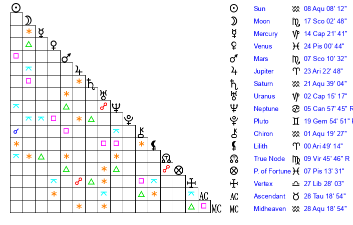 | Sun | 8 Aquarius 8 | 9 Aquarius 2 | 6 Gemini 40 |