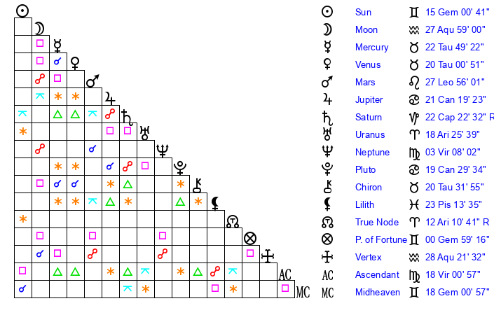 | Sun | 15 Gemini 1 | 16 Gemini 14 | 15 Virgo 4 |