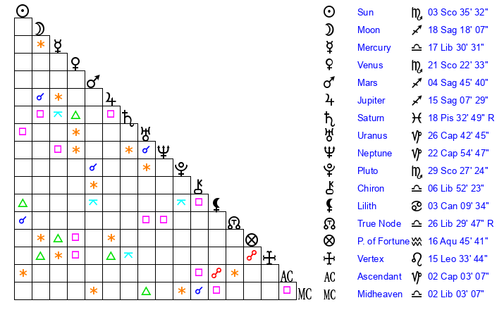 Sun | 3 Scorpio 35 | 4 Scorpio 34 | 2 Sagittarius 44 |
