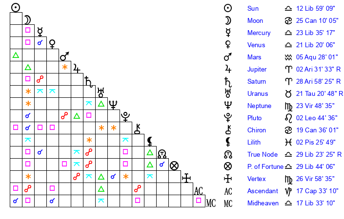 | Sun | 12 Libra 59 | 14 Libra 9 | 9 Capricorn 35 |