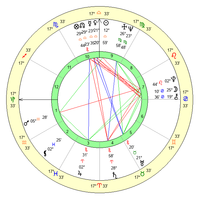 | Moon | 25 Cancer 5 | 14 Aries 10 | 25 Virgo 51 |