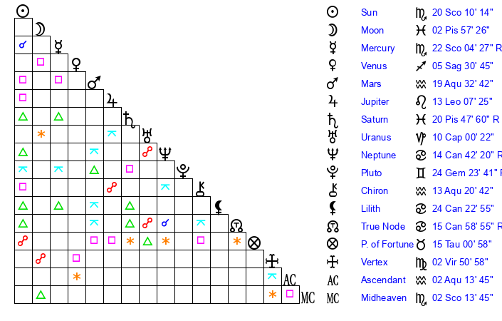 | Sun | 20 Scorpio 10 | 21 Scorpio 34 | 19 Pisces 44 |