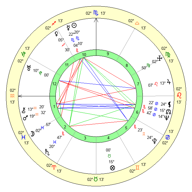 | Moon | 2 Pisces 56 | 9 Virgo 1 | 28 Gemini 42 |