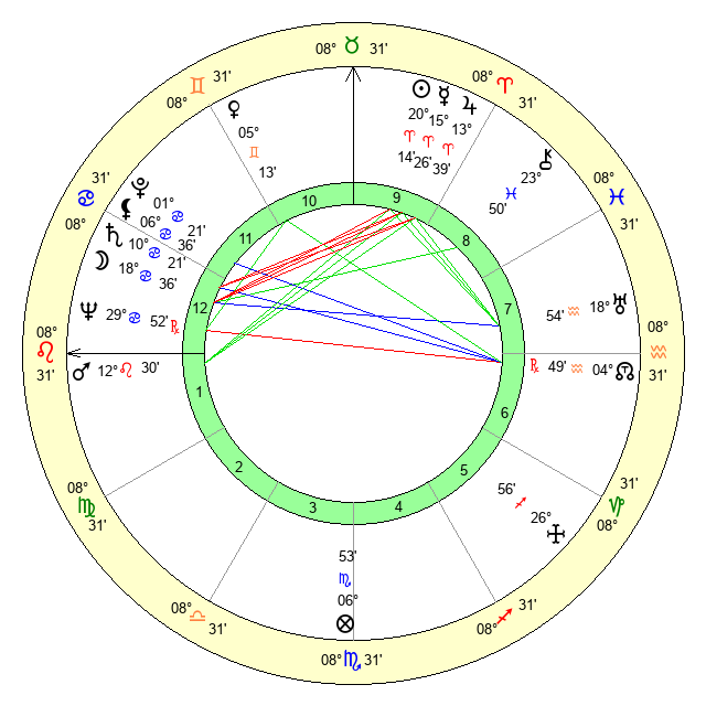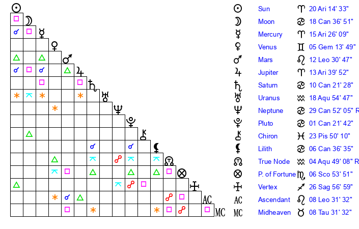 | Sun | 20 Aries 14 | 20 Aries 50 | 5 Leo 0 |