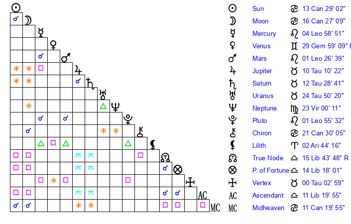 | Moon | 16 Cancer 29 | 15 Scorpio 30 | 25 Leo 52 |