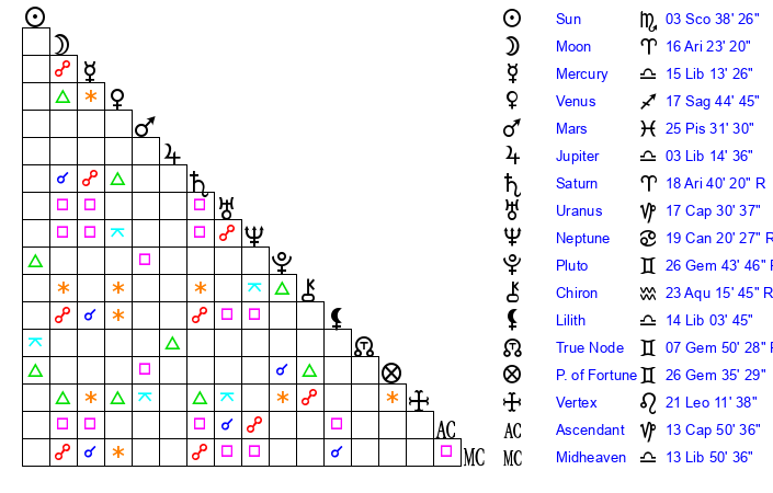 | Saturn | 19 Aries 15 | 25 Pisces 54 | 20 Aries 14 |