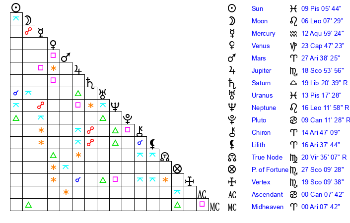 | Neptune | 16 Leo 11 | 28 Pisces 53 | 15 Leo 54 |