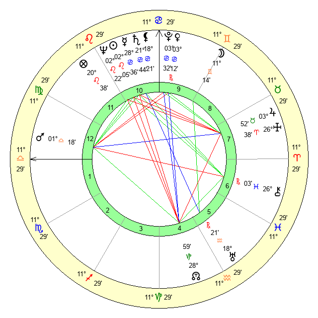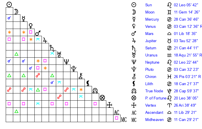 | Moon | 11 Gemini 16 | 10 Leo 29 | 7 Gemini 10 |