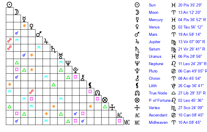 | Saturn | 22 Virgo 15 | 21 Pisces 56 | 19 Virgo 36 |