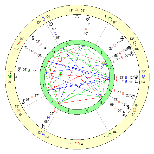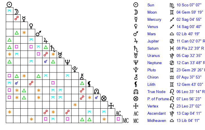 | Sun | 10 Scorpio 7 | 11 Scorpio 16 | 10 Pisces 44 |