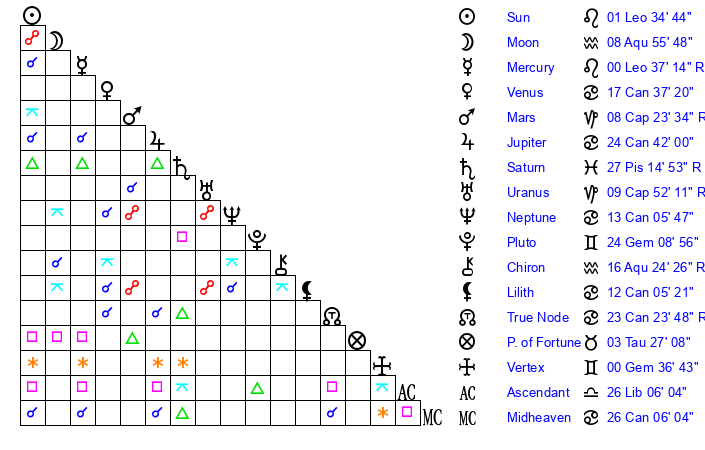 | Moon | 8 Aquarius 55 | 14 Leo 26 | 5 Gemini 17 |