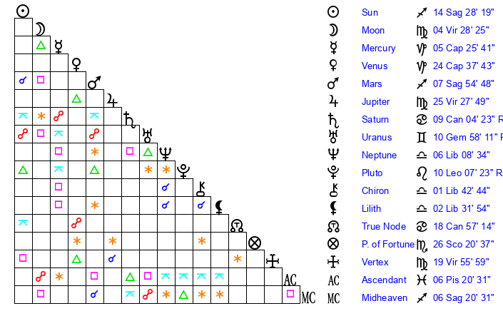 | Sun | 14 Sagittarius 29 | 14 Sagittarius 49 | 6 Pisces 45 |