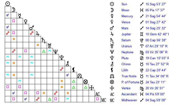 | Sun | 15 Sagittarius 53 | 16 Sagittarius 36 | 23 Pisces 9 |
