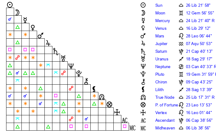 | Moon | 12 Gemini 43 | 18 Libra 34 | 16 Sagittarius 40 |