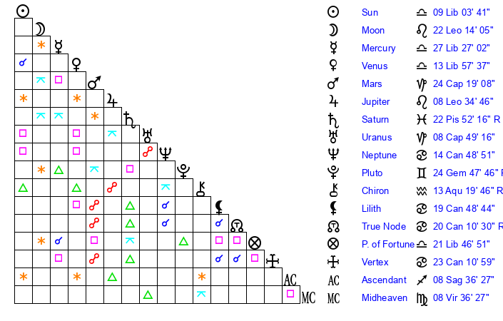 Moon | 22 Leo 15 | 17 Libra 51 | 29 Scorpio 45 |