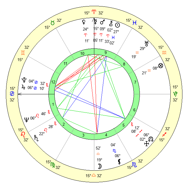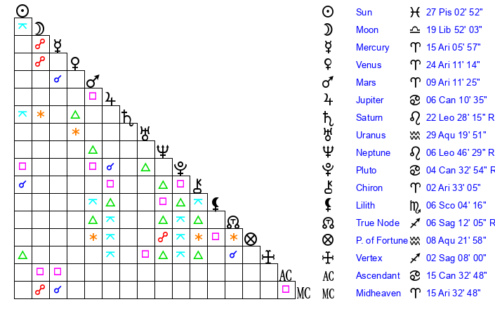 | Mercury | 15 Aries 6 | 8 Aries 48 | 1 Leo 0 |