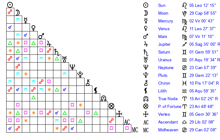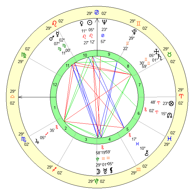 | Moon | 29 Capricorn 59 | 23 Virgo 28 | 15 Pisces 15 |