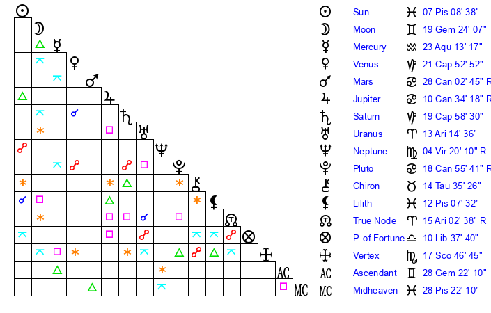 | Moon | 19 Gemini 23 | 20 Aquarius 31 | 10 Sagittarius 34 |