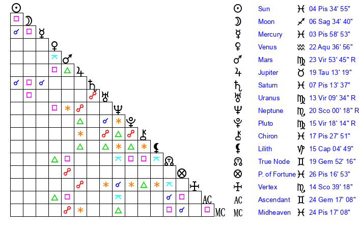 Sun | 4 Pisces 35 | 5 Pisces 2 | 4 Taurus 1 |